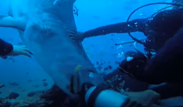Các thợ lặn khác vội vàng lao tới đấm, đá liên tục cho tới khi con cá mập hổ khổng lồ bỏ cuộc và bơi đi.