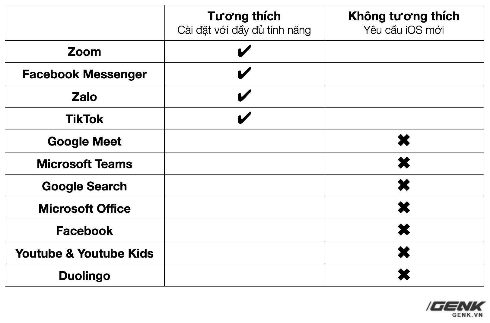 Thế nhưng quan trọng hơn, phần bản iOS cũ khiến cho người dùng không thể cài đặt nhiều ứng dụng bên thứ ba trên App Store. Đa số các ứng dụng phổ biến hiện nay đều yêu cầu iOS 12 hoặc iOS 13.