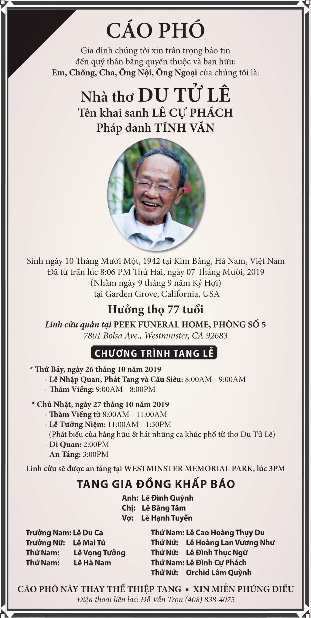 Và hôm nay, khi nghe tin nhà thơ Du Tử Lê qua đời, tôi tin có không ít đồng loại cúa mình, cũng đang mỉm cười và cô đơn đến cuối cùng.
