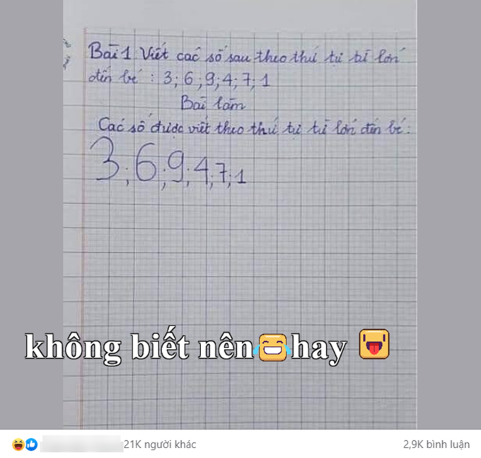 Mới đây, trong bài tập toán của học sinh tiểu học, cô giáo ra đề: "Viết các số sau theo thứ tự từ lớn đến bé: 3, 6, 9, 4, 7, 1", một em học sinh đã làm như sau: