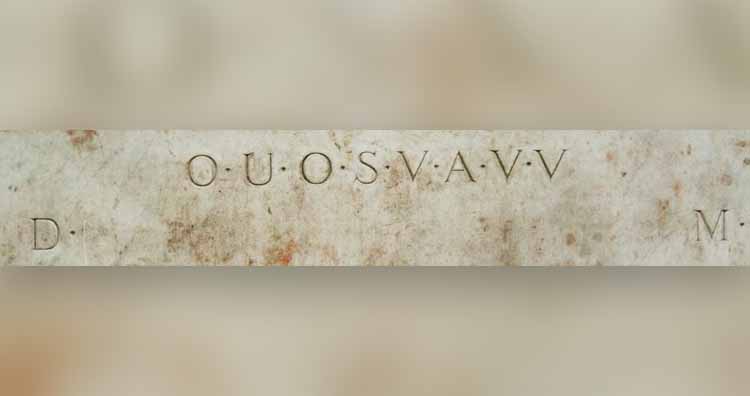 Được khắc trên Đài tưởng niệm người chăn cừu (Shepherd's Monument) thời thế kỷ 18 ở Shugborough Hall, Staffordshire, Anh. Bên dưới hình ảnh phản chiếu bức tranh "Những người chăn cừu ở Arcadia" của Nicolas Poussin, có một dòng mật mã gồm một chuỗi các chữ cái OUOSVAVV giữa các chữ cái D và M.