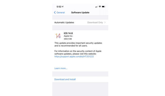 Bản cập nhật iOS 14.8 vá lỗ hổng bảo mật trên iPhone. Giúp người dùng tránh nguy cơ bị tấn công bởi mã độc từ Israel. Trong thông báo mới nhất, Apple cho biết đây là bản cập nhật vá lỗ hổng nghiêm trọng và khuyến khích người dùng nâng cấp.