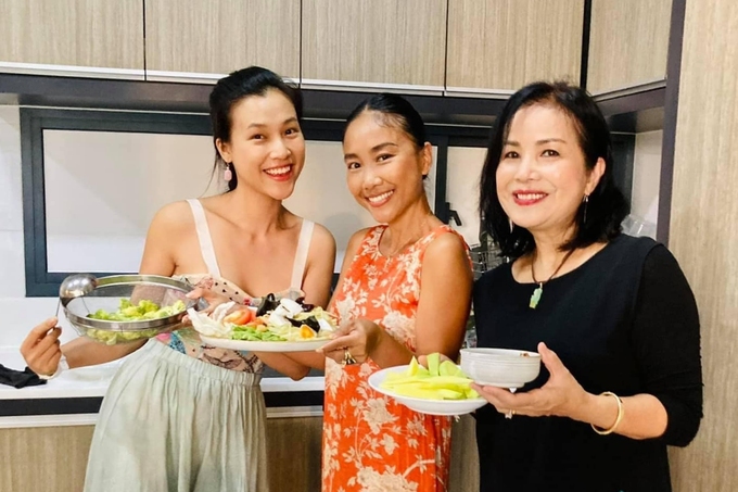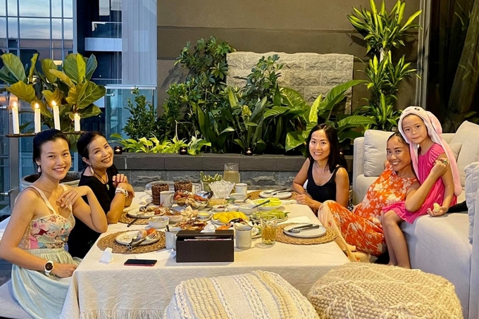Đoan Trang (thứ hai từ phải sang) sang Singapore định cư từ giữa năm nay vì chồng chuyển công tác. Ca sĩ dành nhiều thời gian tự tay vào bếp và chăm sóc gia đình. Hai mẹ con còn tự quay video, biểu diễn tại nhà khi tham gia một chương trình ca nhạc trực tuyến cổ vũ chống dịch. Ảnh: Facebook Hoàng Oanh
