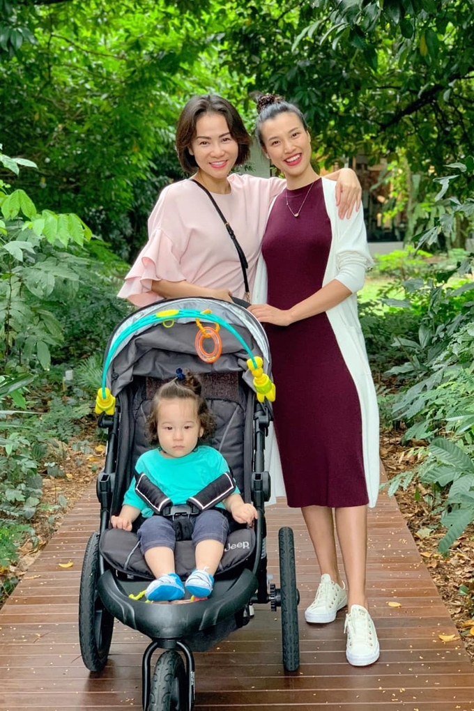 Hoàng Oanh dắt con trai - bé Max - đi chơi công viên cùng Thu Minh. Cô cho biết ở Singapore, cuộc sống đã gần như trở lại bình thường. Cô vẫn cố gắng duy trì công việc dẫn chương trình, tham gia sự kiện và quay Vlog. Hoàng Oanh mong dịch bệnh sớm kết thúc để về nước. Ảnh: Facebook Hoàng Oanh