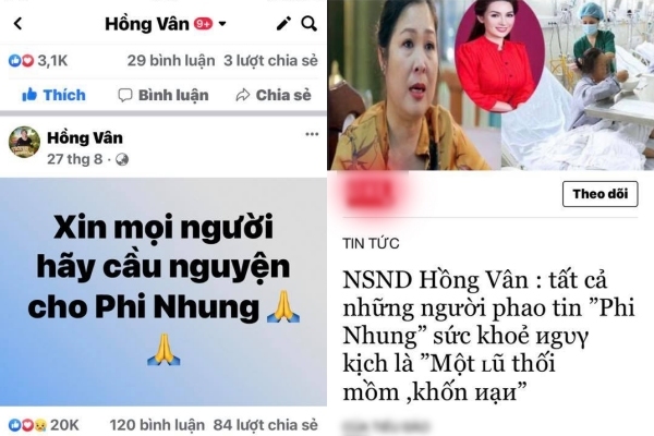 Cụ thể vào ngày 27/8, Hồng Vân đăng đàn trên mạng xã hội như nhiều đồng nghiệp, cùng nhau kêu gọi sự cầu nguyện cho Phi Nhung. Tuy nhiên, một diễn đàn khác lại lấy hình ảnh của cô và bịa đặt với dòng tin: “Tất cả những người phao tin Phi Nhung sức khỏe nguy kịch là một lũ thối mồm”.​ Nhưng thực tế nữ nghệ sĩ không có bất cứ phát ngôn thẳng thắn nào như thế.