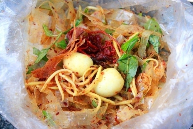 Còn đối với dân mê ăn vặt Sài thành, bánh tráng trộn là món không thể thiếu trên bản đồ ẩm thực. Bịch bánh tráng trộn treo kiểu truyền thống gồm: xoài sống bào sợi, trứng cút, khô bò đen, khô bò đỏ, sa tế, rau răm, muối tôm, đậu phộng... vắt thêm chút tắc tạo độ chua nhẹ, kèm nước bò ăn mãi không thấy ngán. Ảnh: alongwalker