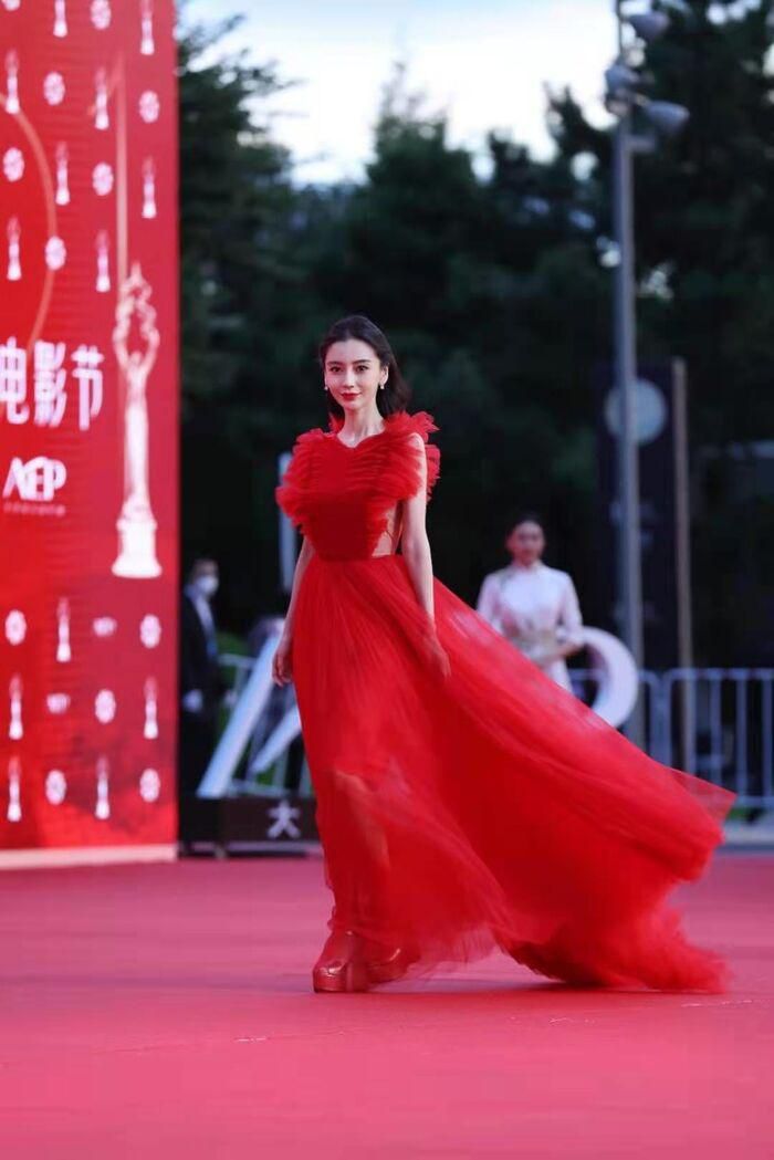 "Đại sứ thương hiệu Angelababy mặc thiết kế Dior Thu/Đông 2021 Ready-to-wear xuất hiện tại LHP Quốc tế Bắc Kinh. Chiếc váy đỏ nhẹ nhàng duyên dáng kết hợp với hoa tai kim cương SATINE và nhẫn DIOR À VERSAILLES, mang đến cảm giác lăng mạn phong t́nh".