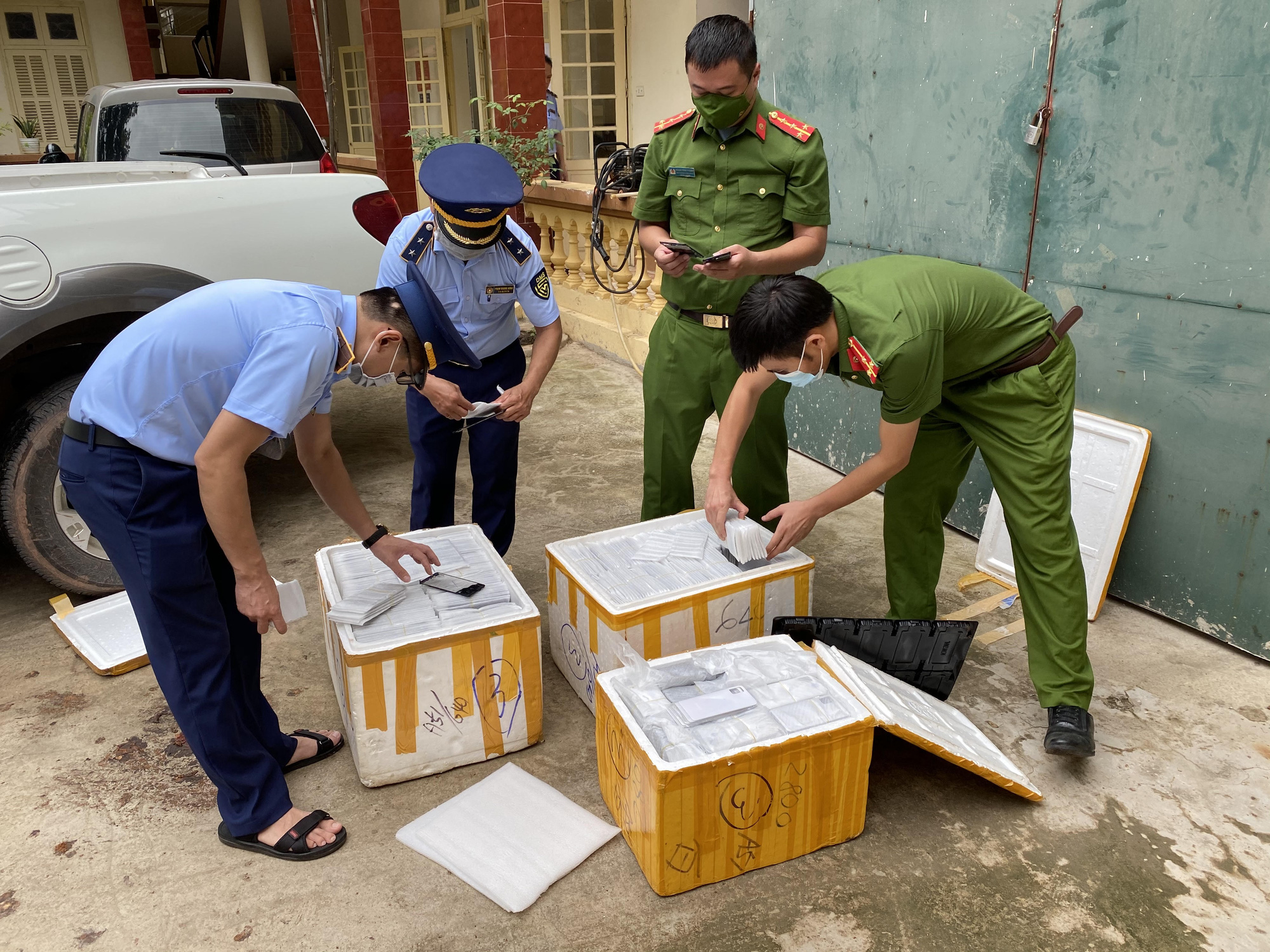 Tổ công tác đă mời chính quyền địa phương và người dân quanh khu vực trên để phối hợp, chứng kiến việc lập biên bản khám đồ vật đối với các thùng xốp trên, qua kiểm đếm thực tế phát hiện 02 loại hàng hóa là linh kiện điện thoại, cụ thể: 1.200 cái khung sườn điện thoại có kư hiệu A-5, kích thước 15,5cm x 7cm và 2.680 ốp lưng điện thoại có in chữ Samsung, kích thước 15,5cm x 7cm. Toàn bộ số hàng hóa trên đều không có hóa đơn, chứng từ chứng minh nguồn gốc xuất xứ và chưa xác định được chủ sở hữu.
