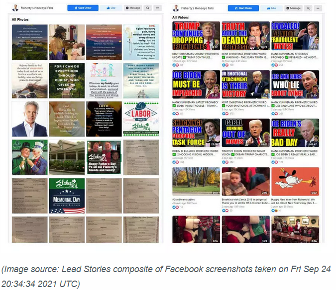 The misleading headline appears on a video published on Facebook by a page called "Flaherty's Honeoye Falls" on September 22, 2021, with this headline: