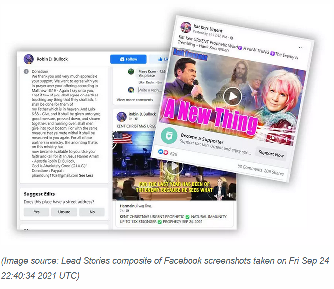 Most of the content found in these spam networks hits political and QAnon themes. This portion of the spam network is using freebooted videos of sermons. These have been reworked with avatars in the corners, possibly to defeat AI recognition tools. Freebooting is a type of content piracy, taking someone else's content to use to make money without investing the time and production effort. This cuts out the original content creator from potential profits and growth of their audience. Some of the pastors whose content has appeared recycled on these network pages are Kat Kerr, Hank Kunneman, Kent Christmas, Robin D. Bullock, Timothy Dixon, Deborah Williams and Amanda Grace.
