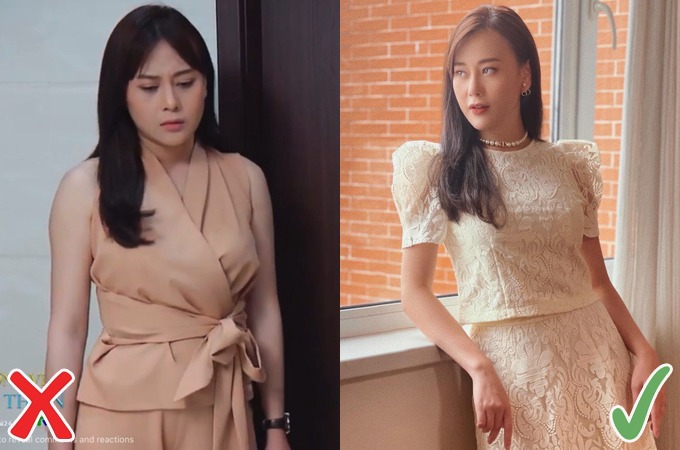 Phương Oanh bị nhiều khán giả chê kém thon khi mặc áo không tay, thắt nơ cầu kỳ ở eo. Trong một tập phim khác, diễn viên 'Hương vị tình thân' nữ tính, gọn gàng hơn nhờ phối áo lửng tay bồng cùng chân váy nhẹ nhàng. Set váy ren đứng phom cũng phù hợp với vóc dáng hơn là kiểu trang phục quá mềm, nhiều chi tiết.