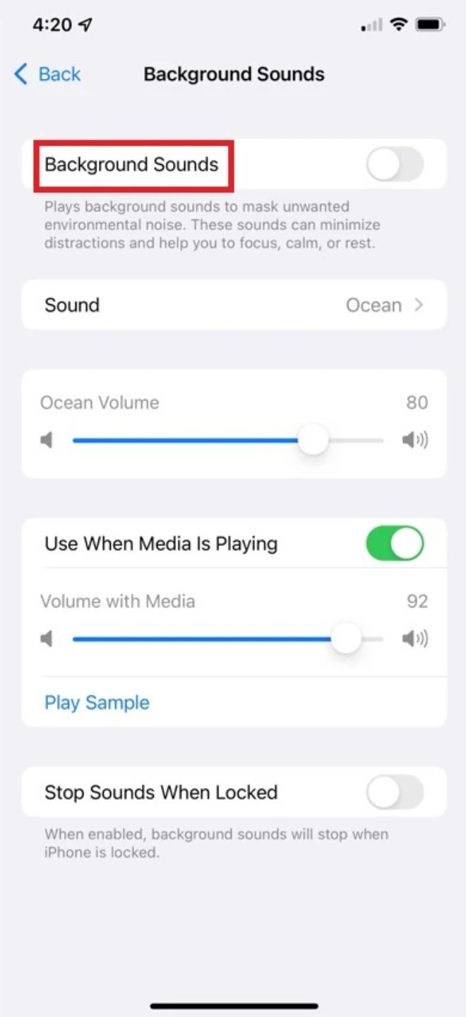 Để bật tính năng này, hăy đi tới Settings > Accessibility > Audio/Visual > Background Sounds. Người dùng có thể đặt báo thức bằng thanh trượt âm lượng và để nó phát hoặc không phát khi phương tiện khác đang chạy.
