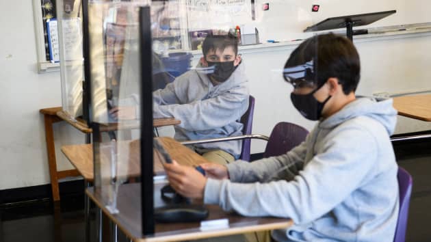 Theo US News, trong 200 học khu lớn nhất ở Mỹ, 69 học khu bắt buộc đeo khẩu trang đối với tất cả học sinh, 106 học khu không bắt buộc, 21 học khu chưa quyết định, và 4 trường hợp để học sinh và nhân viên tự lựa chọn.