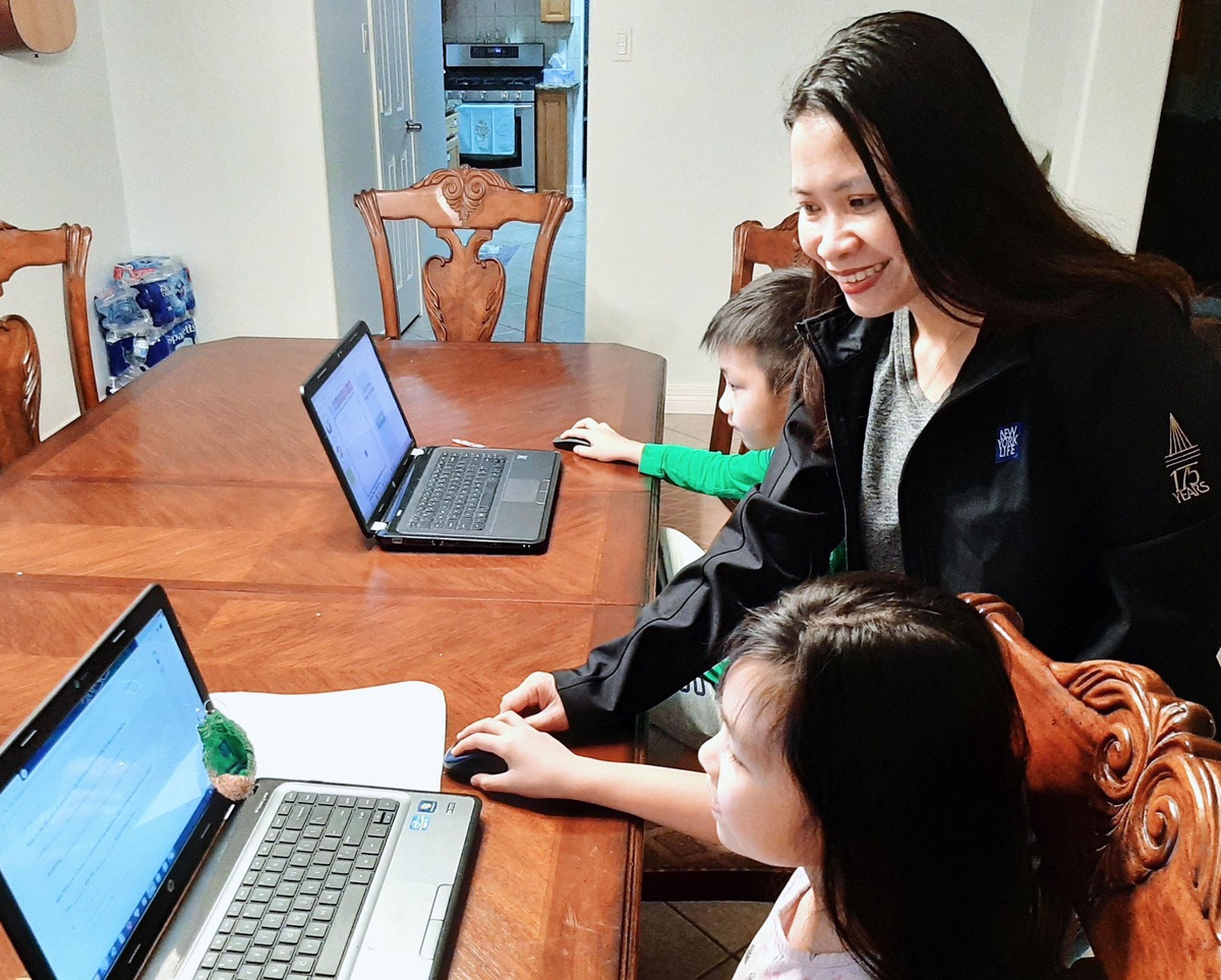 Chị Oanh Trần hướng dẫn các con học online. Ảnh: NVCC.