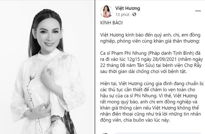 Việt Hương cho biết: "Hiện tại, Việt Hương cùng gia đình đang chuẩn bị các thủ tục cần thiết để chăm lo vẹn toàn cho hậu sự của ca sĩ Phi Nhung. Vì thế, Việt Hương rất mong quý báo, anh chị em đồng nghiệp và khán giả thông cảm nếu Việt Hương không thể nhận điện thoại cũng như trả lời những tin nhắn động viên, chia buồn vào lúc này".