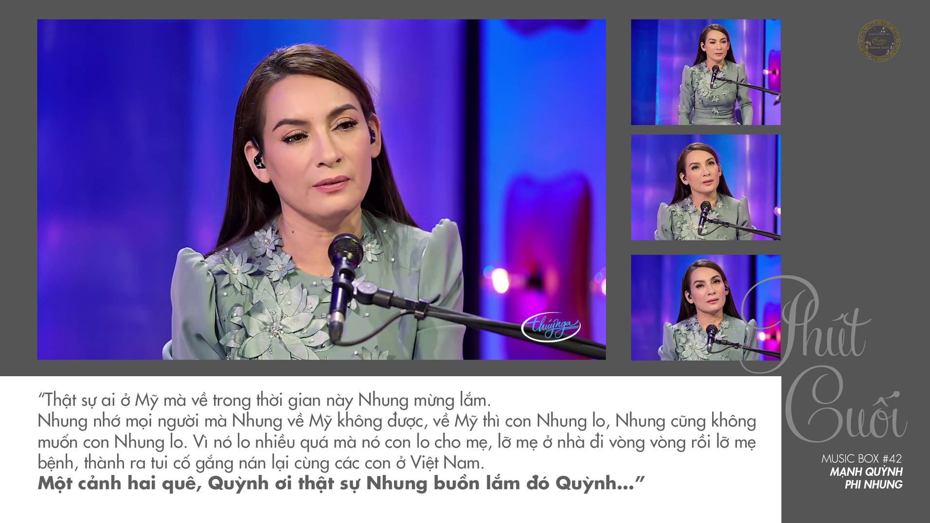 Xin lỗi mọi người mình vốn không muốn đem lại cảm xúc tiêu cực đến mọi người, nhưng đây là những dòng cảm xúc thật, mình đã không còn để ý đến giọng hát hay dở, không để ý âm thanh ánh sáng như mọi khi. Mà chỉ để ý những khoảnh khắc giữa hai người, những câu nói làm tim thắt lại của chị Phi Nhung.