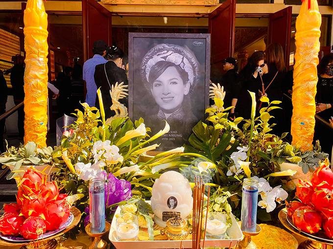Tang lễ của ca sĩ Phi Nhung được tổ chức tại chùa Huệ Quang (California) trưa ngày 12/10 (giờ địa phương), tức sáng 13/10 (giờ Hà Nội). Tro cốt của nghệ sĩ được vợ chồng Việt Hương đưa từ TP HCM về Mỹ theo nguyện vọng gia đình.