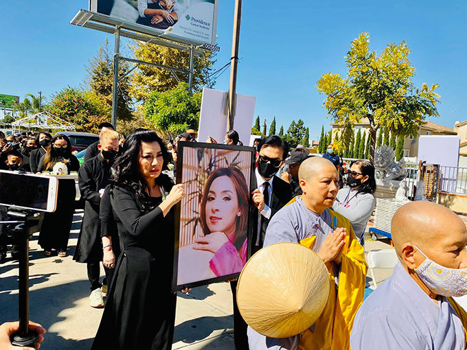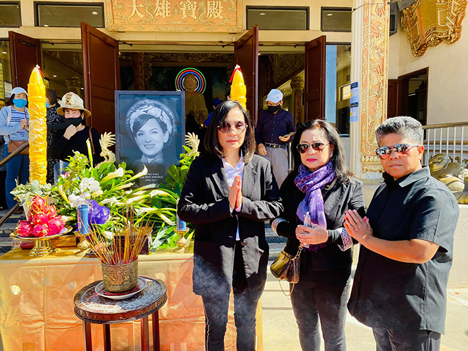 Tro cốt của cố nữ ca sĩ Phi Nhung được vợ chồng Việt Hương đưa từ Việt Nam về Mỹ theo nguyện vọng gia đình, vì vậy tang lễ của ca sĩ Phi Nhung được tổ chức tại chùa Huệ Quang (California) trưa ngày 12/10 (giờ địa phương), khiến có nhiều thế hệ nghệ sĩ tại hải ngoại như Mạnh Quỳnh, Nguyễn Hồng Nhung, Quang Minh, Hồng Đào... tề tựu viếng ca sĩ Phi Nhung sáng 13/10.