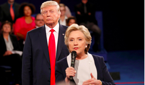 Tổng thống Trump đứng sau bà Hillary Clinton trong cuộc tranh luận tại thành phố St. Louis, bang Missouri hồi tháng 10/2016. Ảnh: Reuters.