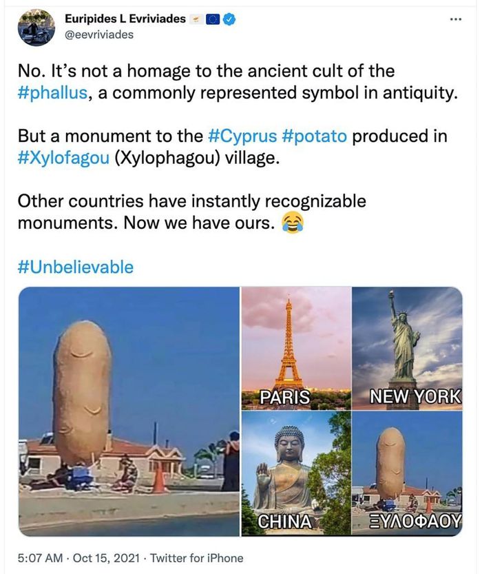 Mới đây, một bức tượng hình củ khoai tây cao 5 mét được dựng ở lối vào chính của làng Xylophagou đã gây ra tranh cãi lớn vì hình thù đặc biệt. Theo Reuters, chính quyền làng Xylophagou (Cộng hòa Síp) đã dựng một bức tượng lớn bằng sợi thủy tinh để chào đón du khách tới thăm làng cũng như tôn vinh các loài củ quả đặc sản trong vùng.