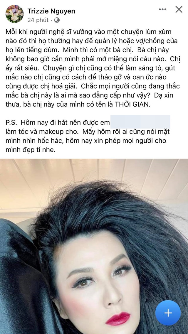Mới đây, trên trang cá nhân Trizzie Phương Trinh đã đăng tải bài viết ẩn ý về chuyện giải oan cho Phi Nhung. Cụ thể, nữ ca sĩ viết: “Mỗi khi người nghệ sĩ vướng vào một chuyện lùm xùm nào đó thì họ thường hay để quản lý hoặc vợ/chồng của họ lên tiếng dùm. Mình thì có một bà chị. Bà chị này không bao giờ cần mình phải mở miệng nói câu nào. Chị ấy rất siêu. Chuyện gì chị cũng có thể làm sáng tỏ, gút mắc nào chị cũng có cách để tháo gỡ và oan ức nào cũng được chị hoá giải. Chắc mọi người cũng đang thắc mắc bà chị này là ai mà sao đẳng cấp như vậy? Dạ xin thưa, bà chị này của mình có tên là thời gian.”
