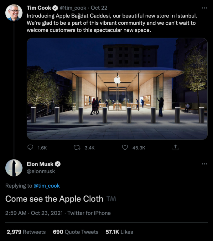 CEO Tim Cook mời mọi người đến Apple Store mới khai trương ở Thổ Nhĩ Kỳ, nhưng Musk chế giễu rằng hãy đến đó và xem "Apple Cloth" (Vải Táo).