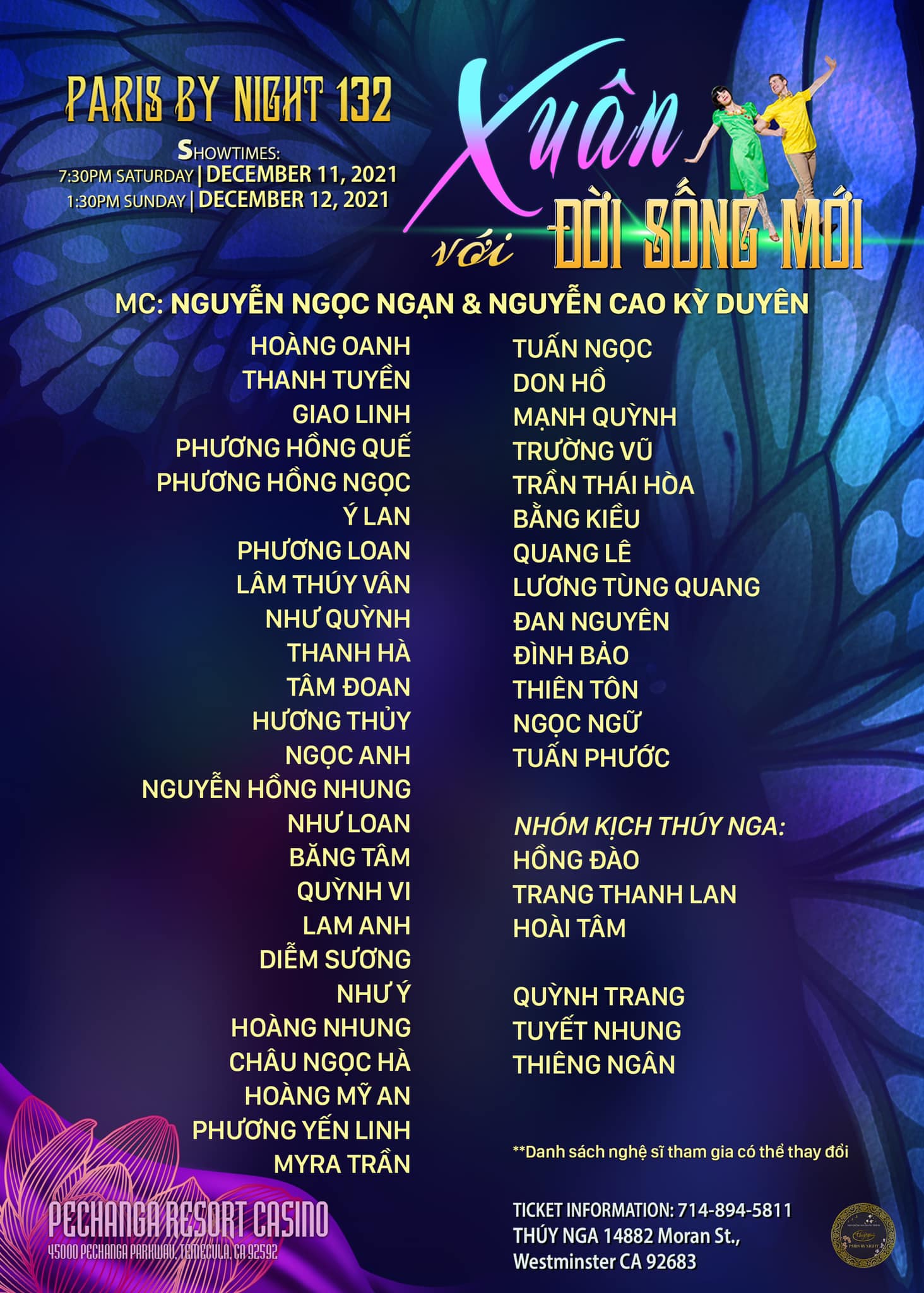 Một trong những show đáng xem nhất lại chính vào thời điểm cuối năm nay. Chương trình Paris by Night quay trở lại với dàn nghệ sĩ hùng hậu dưới đây. Với chủ đề Xuân với đời sống mới một phần nào nói lên sự thực hiện tại.