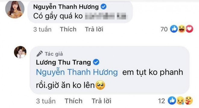 Mới đây, Lương Thu Trang còn khoe ảnh chụp toàn thân khoe vòng eo nhỏ đến mức không tưởng. Cô than thở “Gầy thì mọi người gọi là mắm. Mà mập mọi người gọi là heo. Sắp off vai mọi người vote cho em cái kg nặng để em phấn đấu nào". Dường như Lương Thu Trang cũng rất đau đầu khi bị giảm cân quá nhanh như thế này.