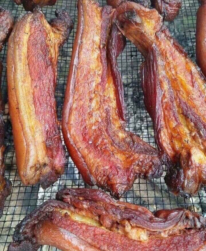 Đây là món ăn đặc trưng của người Mông. Xuất phát từ điều kiện kinh tế cũng như giao thương khó khăn, một số đồng bào nơi đây thường mổ lợn vào dịp lễ Tết. Để bảo quản thực phẩm cho cả năm, đặc biệt là dùng cho những ngày có khách quý, người dân đã chế biến ra món đặc sản này. Nguyên liệu chính là lợn đen, giông lợn thích nghi với khí hậu lạnh, khắc nghiệt của vùng núi cao và được chăn thả tự nhiên. Giá mỗi cân từ 500.000 đồng và có thể mua quanh năm.
