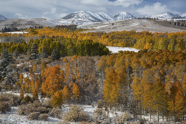 Khu vực Conway, California cũng mang đến một mùa thu với sắc màu thật ngoạn mục của một rừng cây vàng phủ đầy tuyết như chạy dài đến tận chân trời.