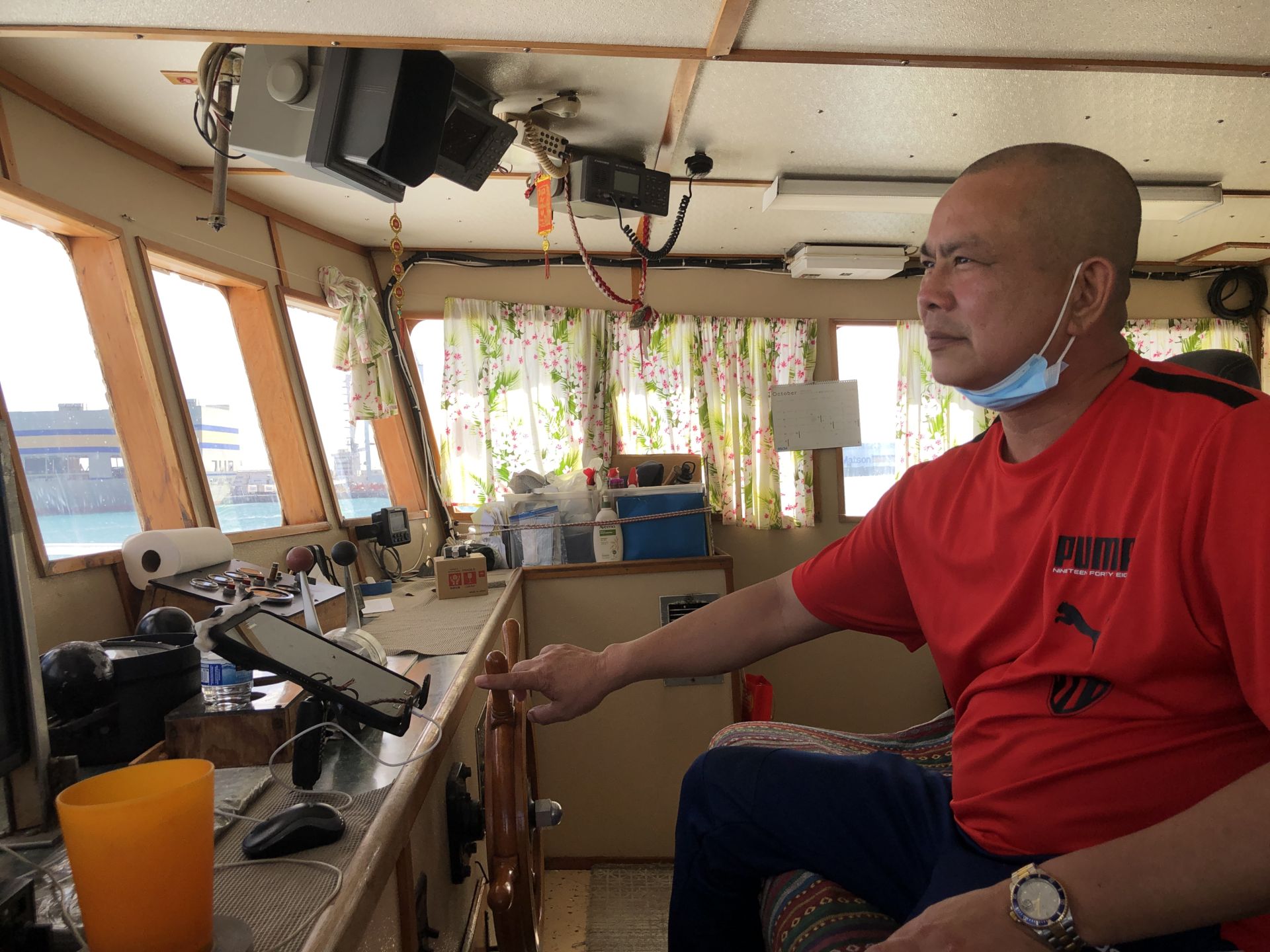 Thuyền trưởng Thuận Nguyễn trên khoang lái của tàu. (Hình: Đoan Trang/Người Việt)