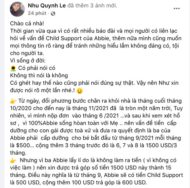 Nên vấn đề tiền cấp dưỡng cho con gái được toà xử và đưa ra quyết định là ba của Abbie phải cấp dưỡng cho bé bắt đầu từ tháng 9/2021 mỗi tháng là 500 USD cộng thêm 3 tháng trước đó là 6, 7 và 8 là 1500 USD/3 tháng.