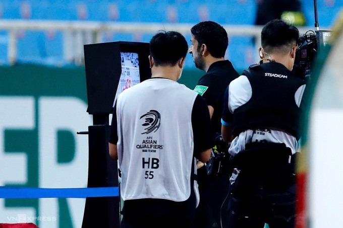 Trọng tài Hassan xem lại tình huống trên màn hình bên ngoài đường biên sân Mỹ Đình. Ảnh: Lâm Thoả