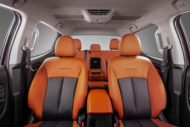 Toàn bộ hai hàng ghế trên xe đều được bọc da cao cấp màu cam - đen. Riêng hàng ghế sau có độ ngả 25° theo thiết kế J-line cùng khoảng để chân lên đến 1.745mm rộng nhất phân khúc sẽ giúp cho người ngồi sau luôn cảm thấy thoải mái, nhất là trong những chuyến đi dài. Trang bị cửa gió điều hòa phía sau trên trần có thể điều chỉnh luồng gió - duy nhất trong phân khúc vẫn có mặt trên hai phiên bản của Triton Athlete.