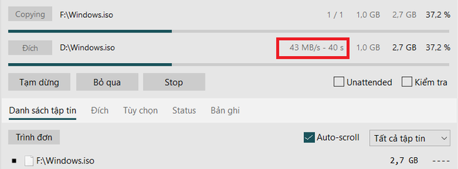 Bạn có thể dễ dàng nhận ra tốc độ dữ liệu được sao chép bằng TeraCopy nhanh hơn nhiều lần so với sử dụng chức năng mặc định của Windows.