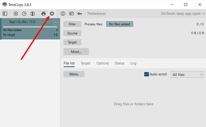 Phần mềm có hỗ trợ giao diện Việt. Tuy nhiên, mặc định giao diện trên phần mềm sẽ hiển thị bằng tiếng Anh. Để chuyển giao diện phần mềm sang tiếng Việt giúp sử dụng thuận tiện hơn, từ giao diện chính của TeraCopy, bạn nhấn vào nút "Cài đặt" (biểu tượng bánh răng) trên menu của phần mềm.