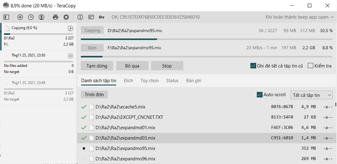 Khi bạn tiến hành di chuyển hoặc sao chép một dữ liệu nào đó, giao diện của TeraCopy sẽ được xuất hiện, hiển thị đầy đủ thông tin chi tiết về quá trình sao chép dữ liệu, như tốc độ sao chép dữ liệu, số file đã được sao chép, có file nào bị lỗi trong quá trình sao chép hay không… nếu xảy ra lỗi trong quá trình sao chép dữ liệu, TeraCopy cũng sẽ cung cấp thông tin lỗi chi tiết, như lỗi do hết dung lượng ổ cứng hay do dữ liệu bị lỗi…