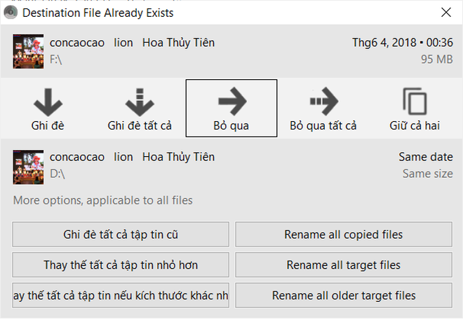 Trong trường hợp file/thư mục được sao chép trùng với các dữ liệu đã có ở thư mục đích, TeraCopy sẽ hiển thị một hộp thoại hỏi ý kiến người dùng xem có muốn ghi đè dữ liệu mới lên dữ liệu cũ hay muốn đổi tên file để không bị trùng lặp. Hộp thoại thông báo do TeraCopy cung cấp khá chi tiết và hoàn toàn bằng tiếng Việt nên bạn có thể dễ dàng có được lựa chọn phù hợp.