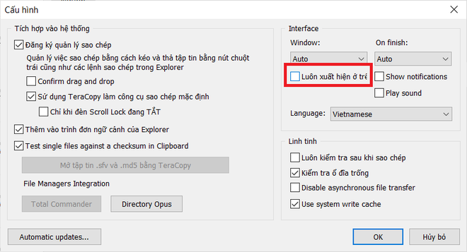 Trong quá trình sao chép/di chuyển dữ liệu, giao diện TeraCopy sẽ ở chế độ luôn hiển thị trên màn hình và che đi giao diện của các phần mềm khác. Điều này sẽ gây bất tiện và khó chịu cho người dùng. Để bỏ chế độ này, bạn truy cập vào mục "Cài đặt" của TeraCopy và đánh dấu bỏ đi tùy chọn "Luôn xuất hiện ở trên cùng".