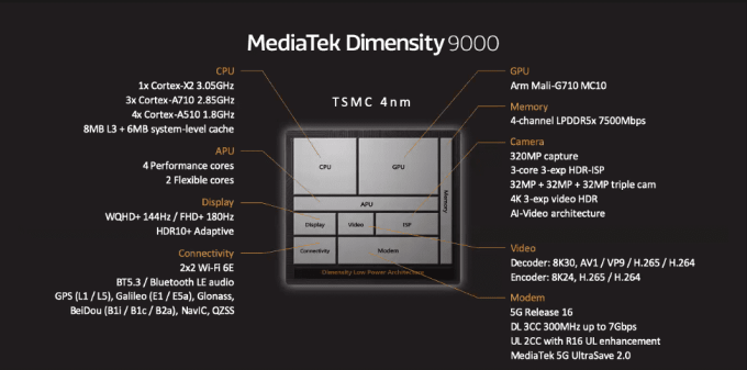 Trong khi đó, Dimensity 9000, được công bố tại sự kiện MediaTek Summit, là mẫu chip mạnh nhất của nhà sản xuất Đài Loan. Sản phẩm được xây dựng trên tiến trình 4nm của TSMC và kiến trúc v9 của ARM. Chip có tám nhân, trong đó một nhân Cortex-X2 hoạt động với xung nhịp 3,05 GHz, ba nhân Cortex-A710 tốc độ 2,85 GHz và bốn nhân Cortex-A510 xung nhịp 1,8 GHz. Sản phẩm còn tích hợp GPU Arm Mali-G710 10 nhân, APU thế hệ thứ năm của MediaTek, hỗ trợ xử lý các tác vụ AI với hiệu suất gấp bốn lần thế hệ trước.