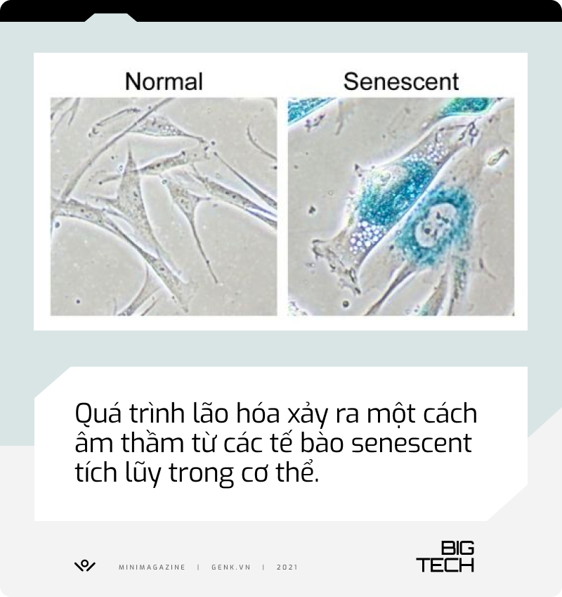 Các nhà khoa học quan sát thấy khi một tế bào bị lão hóa, chúng không chết ngay mà thường tìm đến nhau để sống co cụm. Tế bào senescent không làm việc, không đóng góp chức năng nào cho sự sống của bạn, thay vào đó, chúng lại thải ra các hóa chất độc hại, gây viêm, làm hỏng hoặc thậm chí biến các tế bào khỏe mạnh bên cạnh thành tế bào lão hóa.