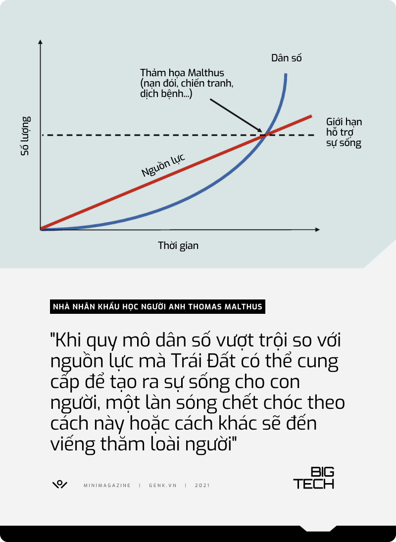 Nhưng nếu sự gia tăng dân số này không được kiểm soát và vượt ra khỏi khả năng nuôi sống tất cả chúng ta, một thảm họa Malthus được đặt theo tên ông sẽ xuất hiện. Chiến tranh tranh giành nguồn lực, đói nghèo, dịch bệnh và sau đó là biến đổi khí hậu cuối cùng sẽ làm nhiệm vụ "reset" dân số toàn cầu về một ngưỡng bằng với nguồn lực của Trái Đất.