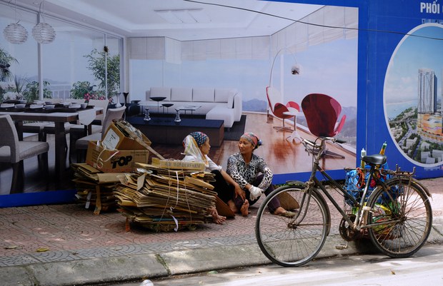 Một người dân đạp xe qua một khu nhà ở đắt tiền đang xây ở Hà Nội năm 2012. AFP