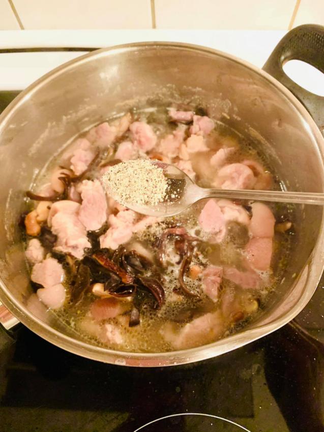 Khi thịt chín mềm thì cho nấm hương, mộc nhĩ đã xào vào nồi. Nêm thêm gia vị cho phù hợp với khẩu vị gia đình. Cho thêm tiêu xay. Đun sôi khoảng 5 phút nữa là tắt bếp.