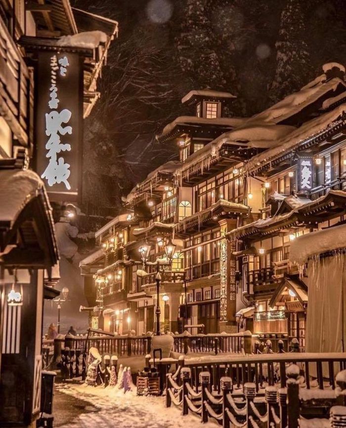 Khi màn đêm buông xuống, toàn bộ khu phố cổ lên đèn rực rỡ, và phong cảnh về đêm vào mùa đông tại Ginzan Onsen được đánh giá là một trong những cảnh đêm đẹp nhất Nhật Bản.