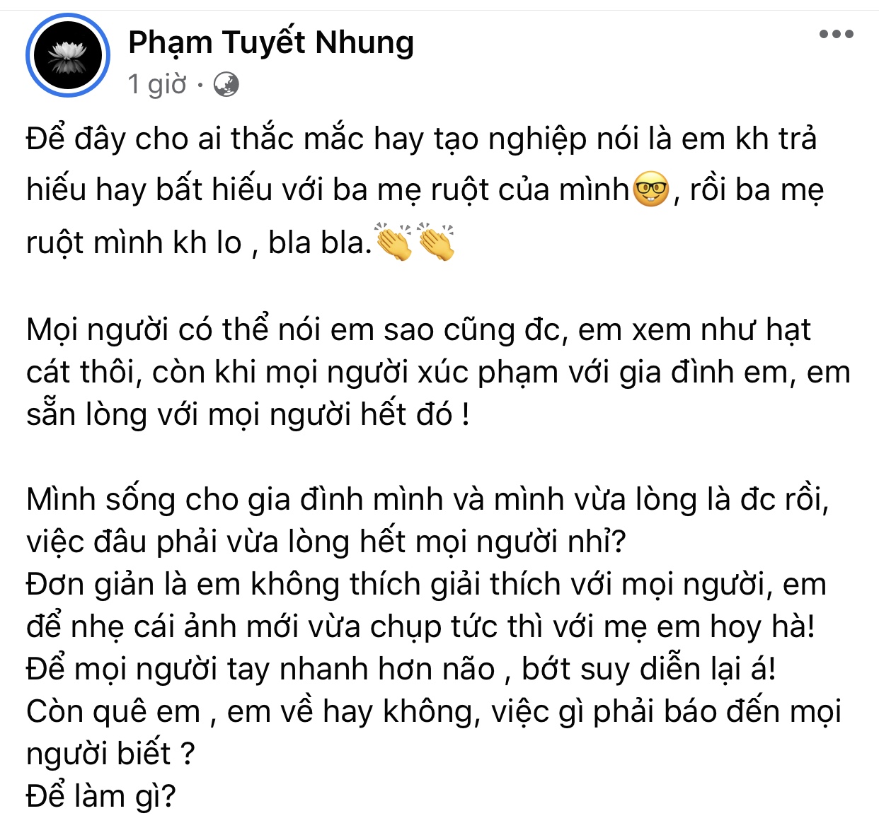 Tuyết Nhung có bài đăng dài bày tỏ sự bức xúc khi bị tố bất hiếu với chính bố mẹ ruột