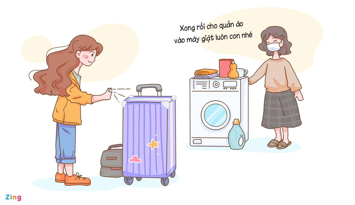Khử khuẩn hành lý ngay khi đến nơi lưu trú: Để hạn chế khả năng lây nhiễm dịch bệnh thông qua tiếp xúc hành lý trên máy bay hay tại sân bay, sau khi đến nơi lưu trú, bạn cần ngay lập tức lau khử khuẩn hành lý, túi xách và các vật dụng đi kèm. Sau đó, hãy tắm và vệ sinh cơ thể bằng nước ấm, đồng thời đi giặt quần áo đã mặc trong hành trình di chuyển.