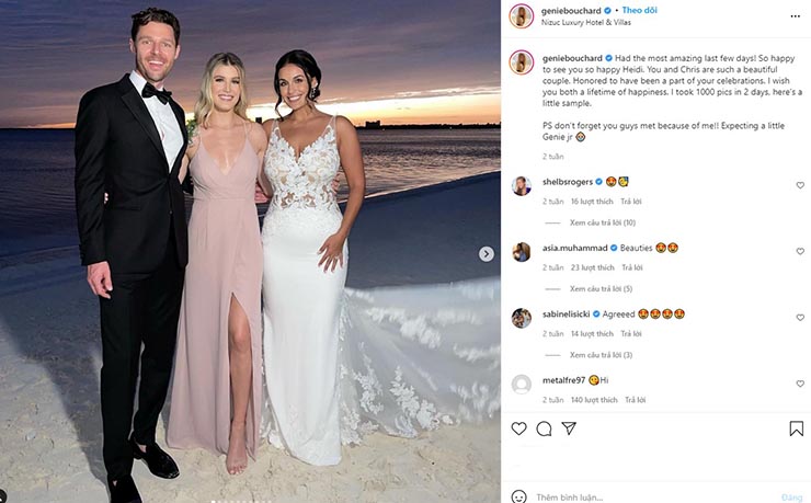 Trên trang Instagram cá nhân, Eugenie Bouchard tự hào rằng chính mình là “bà mối” để giúp cặp đôi quen biết và đến với nhau trong một lễ cưới ấm áp, viên mãn. Rất giỏi trong việc tác hợp hạnh phúc cho người nhưng với mình, có vẻ như cô nàng đa tình này vẫn chưa tìm được bến đỗ thích hợp.