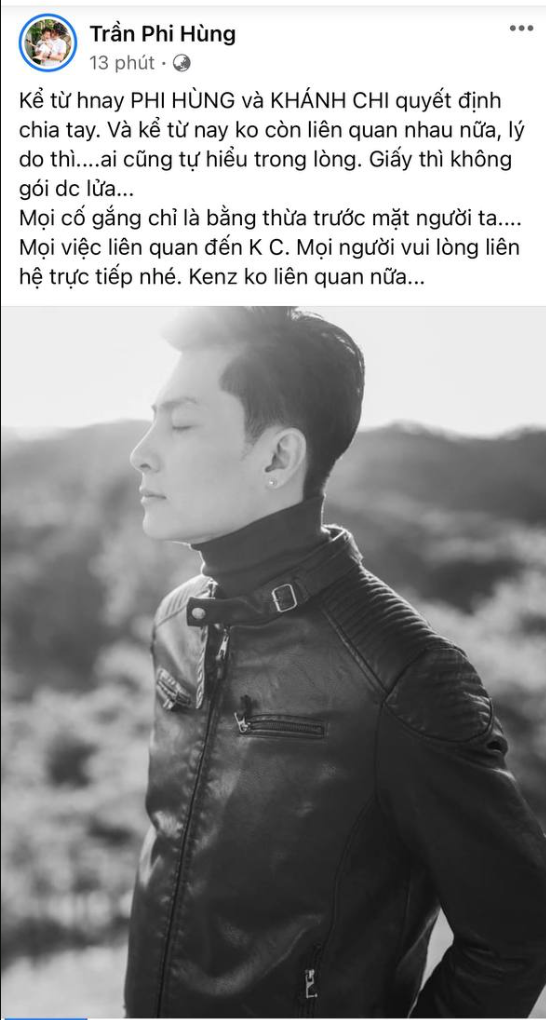 Đến ngày 10/12, ông xã kém 8 tuổi của Lâm Khánh Chi chính thức thông báo cả 2 đã "đường ai nấy đi" sau 4 năm gắn bó. Trên trang cá nhân, anh viết: "Kể từ nay, Phi Hùng và Khánh Chi quyết định chia tay. Và kể từ nay không còn liên quan nhau nữa, lý do thì ai cũng tự hiểu trong lòng. Giấy thì không gói được lửa". Thông tin này khiến nhiều người không khỏi tiếc nuối.