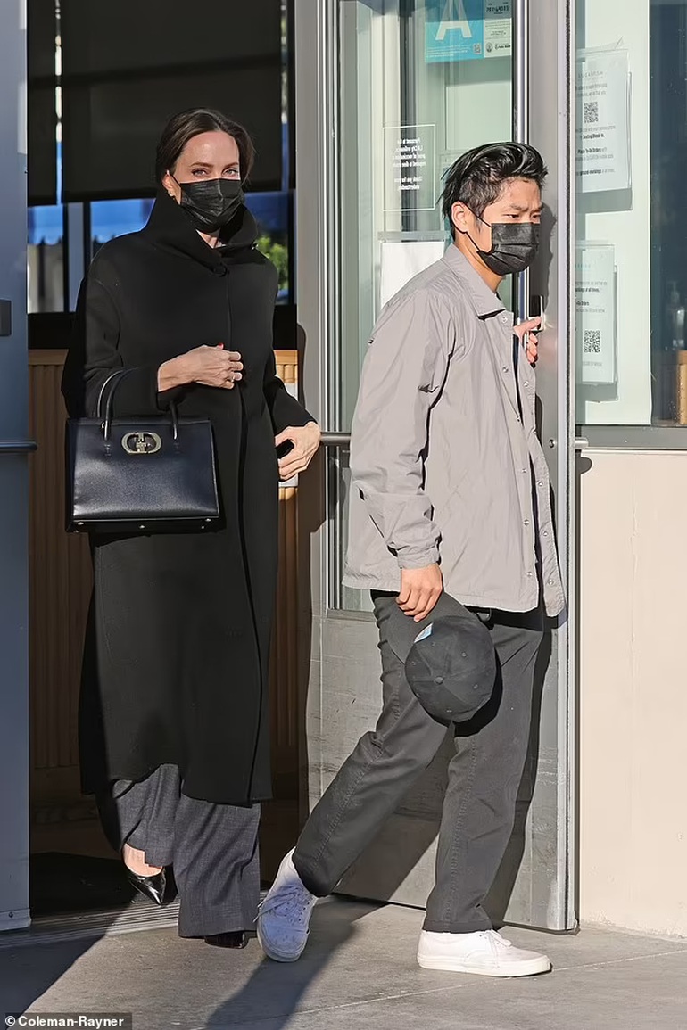 Angelina, 46 tuổi diện áo khoác dài màu đen thanh lịch và kín đáo trong khi Pax Thiên ở tuổi 18 đã rất "ra dáng" một thanh niên chững chạc. Hai mẹ con vừa đi vừa trò chuyện vui vẻ.